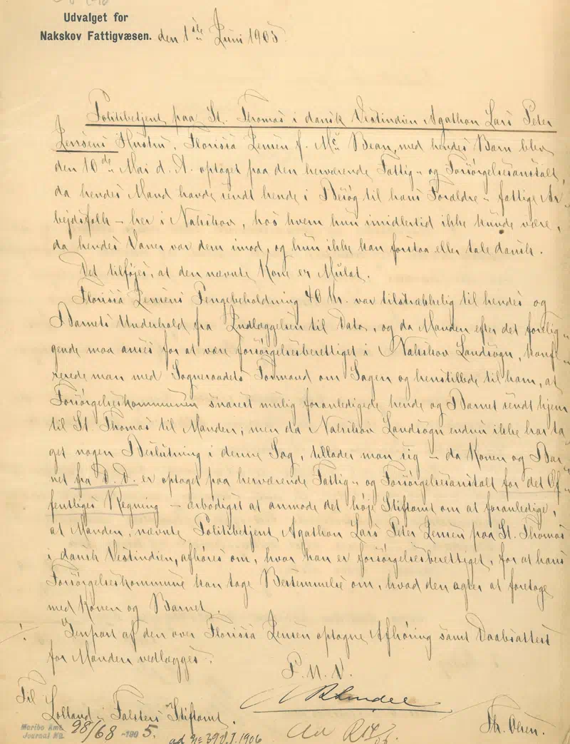 Brevet fra Udvalget for Nakskov Fattigvæsen til Nakskov Landsogn om Florissa Jensen og hendes barns optagelse på Fattig- og Forsørgelsesanstalten i Nakskov 1. juni 1905.
