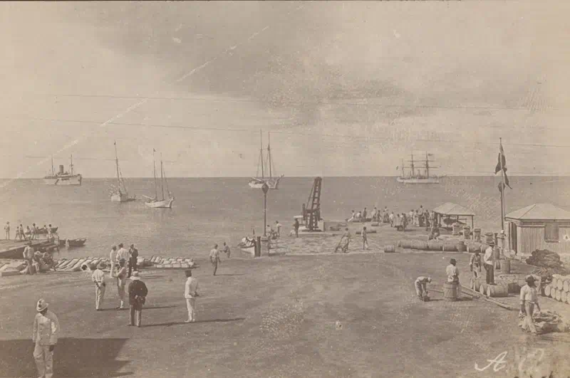 Havnen i Frederiksted på Sct. Croix. En dansk damper ses længst til venstre. Marinens skoleskib Ingolf af København ligger længst til højre. Foto: Det kgl. Bibliotek.