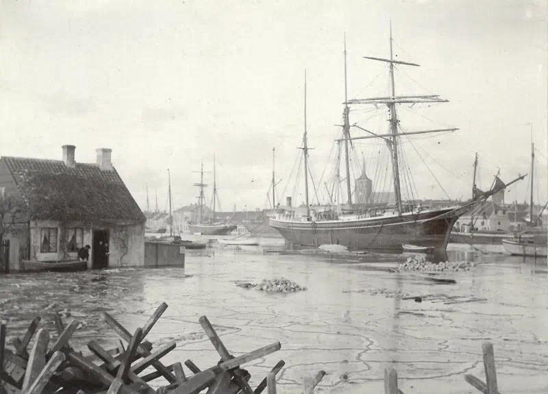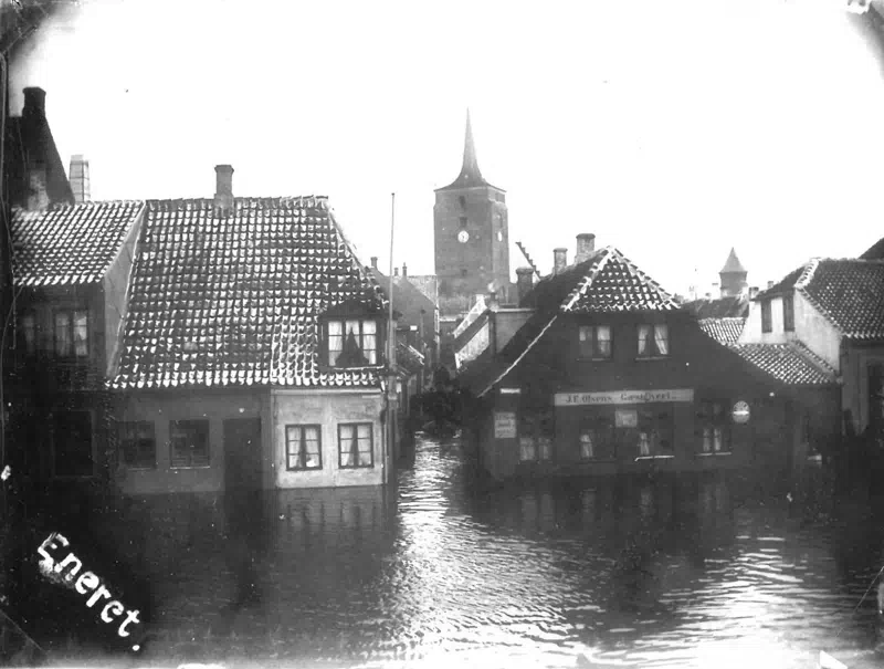 Oversvømmelse i Havnegade og Bibrostræde i Nakskov efter stormfloden, der ramte byen nytårsnat 1904.