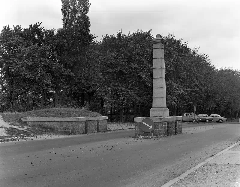 Mindesmærke over stormfloden 1872 i Rødbyhavn. Mindesmærket er samtidig en stormflodssikring, hvor plader kan sættes ned i de murede riller, og dermed beskytte Havnegade. Foto: Erik Hansen, 1972.